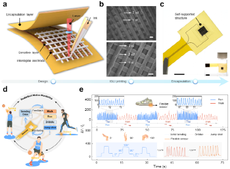 (a-c)柔性传感器打印工艺与集成结构;(d-e)高性能柔性传感器人体运动状态监测应用演示