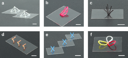 图3激光诱导复杂三维立体结构免支撑成型与多材料打印:(a-b)PDMS;(c)PDMS/NdFeB;(d)Dragon Skin;(e)Ecoflex;(f)含白色、黄色与红色颜料PDMS