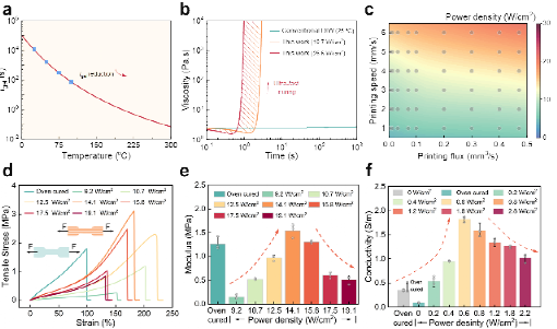 图2激光原位诱导直写3D打印技术快速成型与实时调控:(a-b)激光诱导墨水快速相变;(c)打印工艺优化调控;(d-e)机械性能调控;(f)电学性能调控