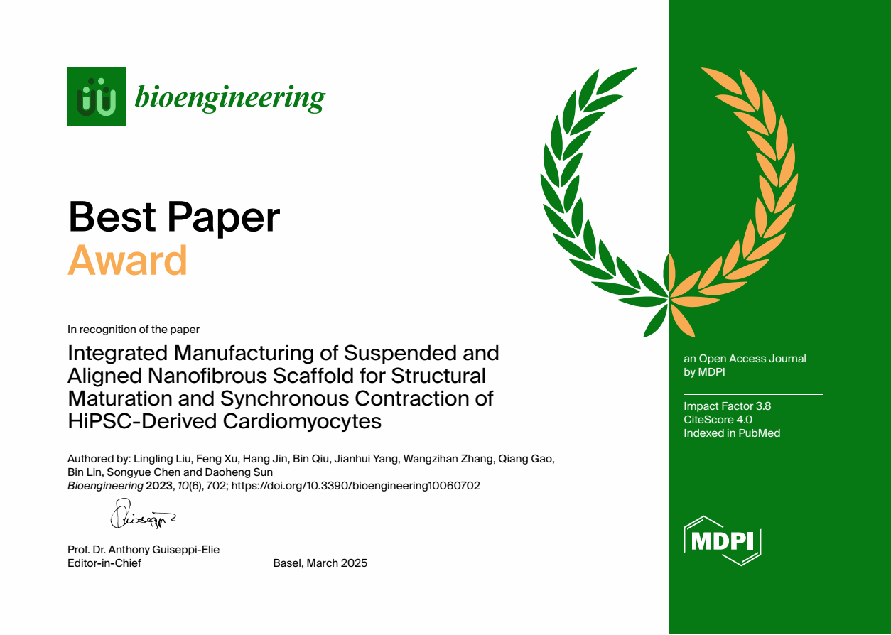 我院孙道恒教授团队在Bioengineering期刊上发表的论文“Integrated Manufacturing of Suspended and Aligned Nanofibrous Scaffold for Structural Maturation and Synchronous Contraction of HiPSC-Derived Cardiomyocytes”(Bioengineering, 2023, 10, 702),在1411篇论文中脱颖而出,荣获该期刊2023年的年度最佳论文奖!Bioengineering最佳论文每年颁发一次,以表彰具有高质量、科学意义和广泛影响力的出版物。评选委员会主要根据论文的科学价值及影响力、原创性、及发表后一年内的引用及下载情况等标准,评选出前一年发表的两篇质量卓越的文章,在3月底在线公布并给与奖励。