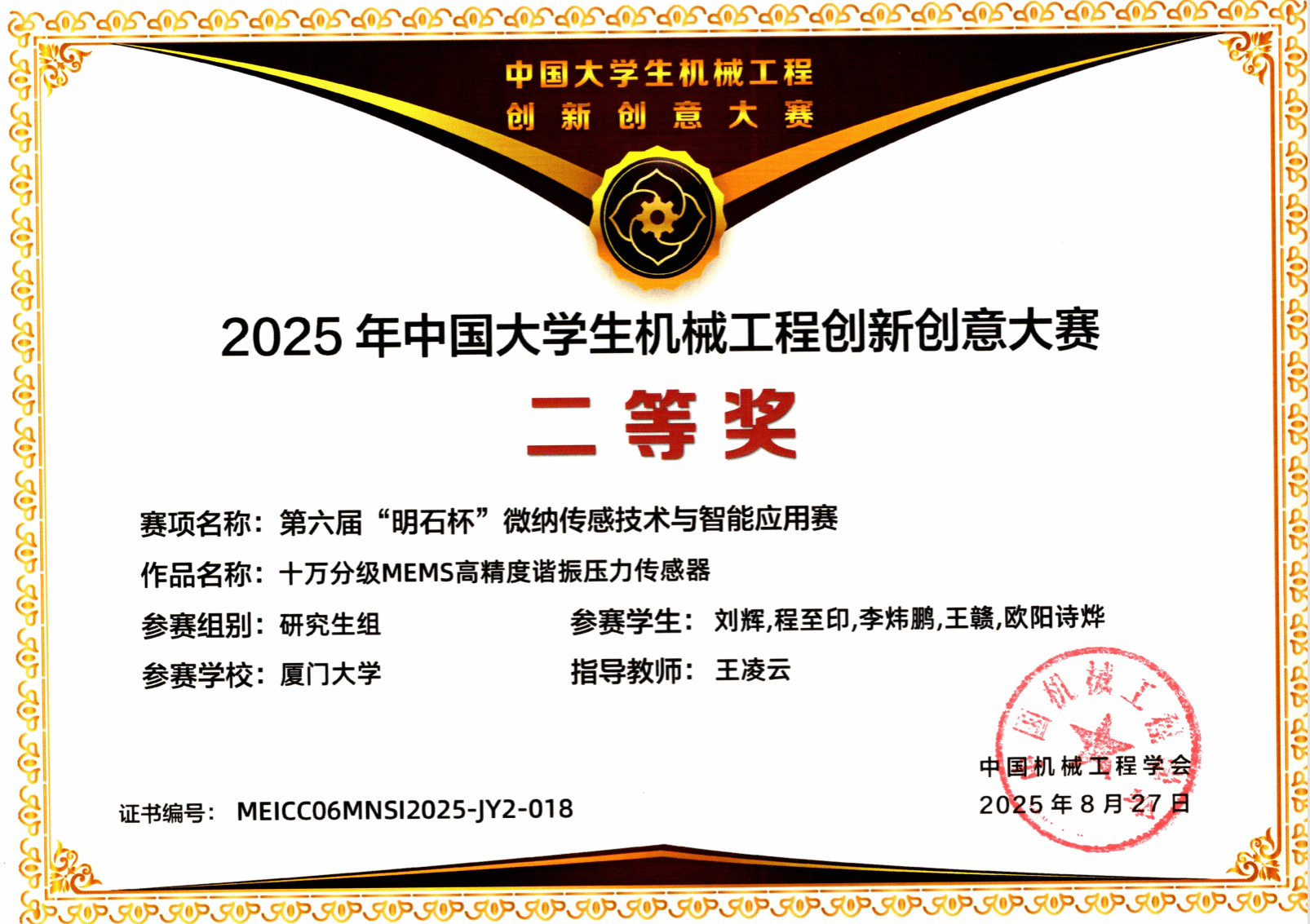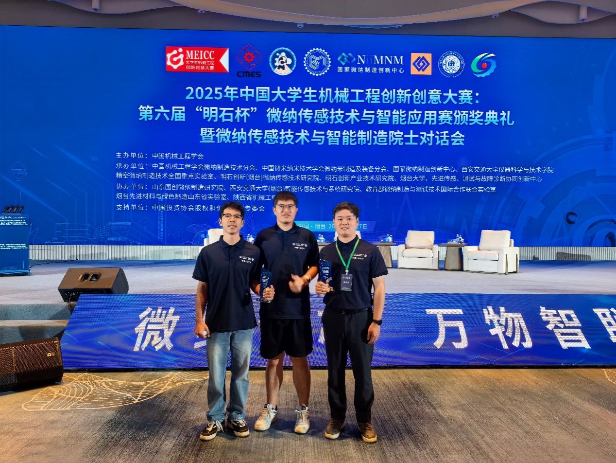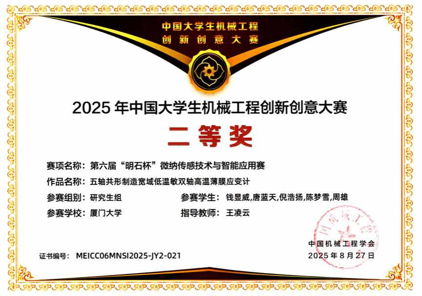 近日,2025年中国大学生机械工程创新创意大赛——第六届“明石杯”微纳传感技术与智能应用赛全国总决赛在山东烟台圆满落幕。由我校王凌云老师指导,钱显威、唐蓝天、倪浩扬、陈梦雪、周雄等研究生组成的参赛团队,凭借作品《五轴共形制造宽域低温敏双轴高温薄膜应变计》脱颖而出,荣获全国二等奖。由王凌云老师指导,刘辉、程至印、李炜鹏、欧阳诗烨、王赣等研究生组成的参赛团队,凭借作品《十万分级MEMS高精度谐振压力传感器》脱颖而出,荣获全国二等奖。