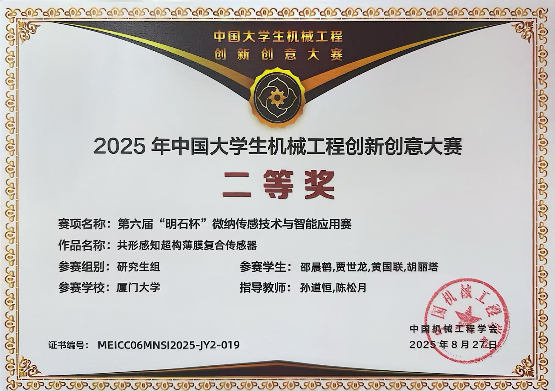 8月26日至27日,2025年中国大学生机械工程创新创意大赛:“明石杯”微纳传感技术与智能应用赛总决赛在滨海城市山东烟台举行。厦门大学萨本栋微米纳米技术研究院孙道恒、陈松月老师指导的参赛团队(邵晨鹤、贾世龙、黄国联、胡丽塔)在总决赛中斩获研究生组二等奖!