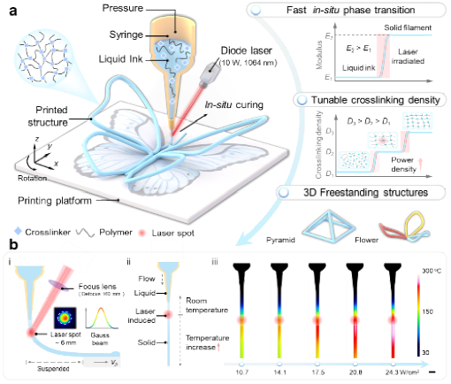 图1激光原位诱导直写3D打印技术制备三维热固性器件:(a)打印工艺示意图;(b)激光诱导直写打印行为与光热效应演化