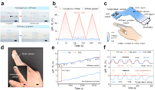 图4激光原位诱导打印刚度梯度可拉伸柔性电子器件:(a)均匀刚度与刚度梯度柔性基底拉伸对比;(b)刚度梯度基底应变干扰抑制;(c-f)刚度梯度集成可穿戴电子皮肤应用验证