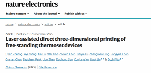 近日,课题组吴德志教授团队在3D打印取得突破性进展。团队首次提出并验证“激光原位诱导直写打印”技术:通过激光原位诱导与3D打印射流相耦合,颠覆传统热固性材料成型方式,实现三维柔性结构原位、快速成型与性能实时调控。该技术大幅缩短固化时间,三维结构成型无需额外牺牲材料与繁琐后处理步骤,可在空间维度实时编程调控打印结构机械与电学性能。将为柔性电子、软体机器人、器官芯片与生物支架等亟需三维复杂结构增材制造与多功能集成的领域开创全新范式。相关研究成果以“Laser-assisted direct three-dimensional printing of free-standing thermoset devices”为题,于2025年11月7日发表在国际顶级期刊Nature electronics (IF:40.9,DOI: https://doi.org/10.1038/s41928-025-01491-2)。