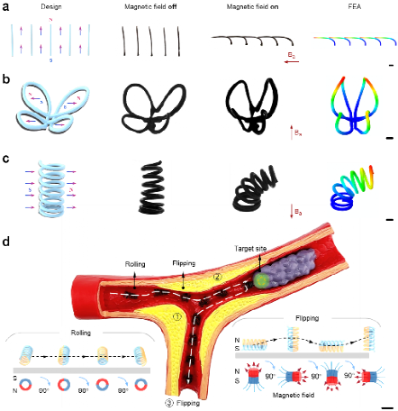(a-c)三维磁软体机器人结构与驱动响应:垂直圆柱阵列、三维仿生蝴蝶与三维螺旋弹簧;(d)三维螺旋弹簧机器人血管模型内靶向给药应用演示
